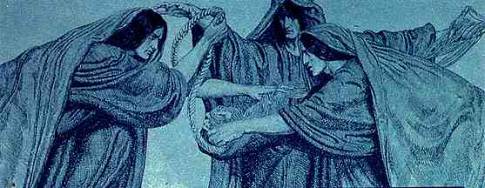 The Greeks knew them as the Morari: Clotho, Lachesis and Atropos. To the Romans they were the Parcae: Nona, Decima, and Morda. The hag spools the thread from her spindle to the middle woman who measures it, passing it on to the youth who, faceless, cuts it with her shears.